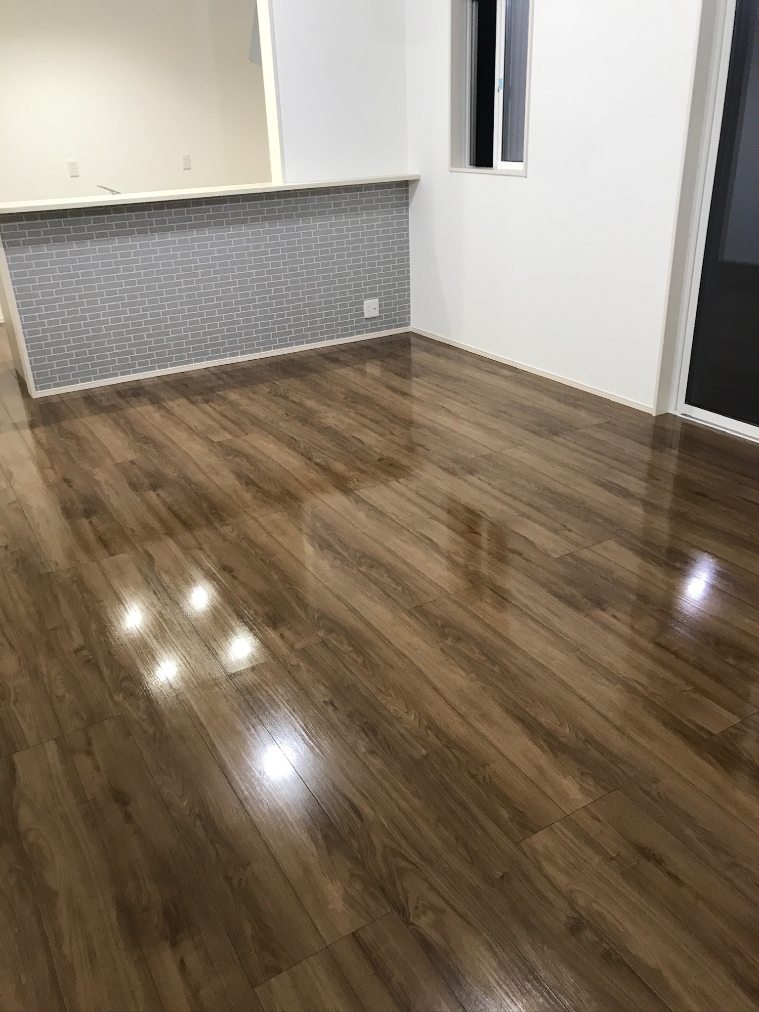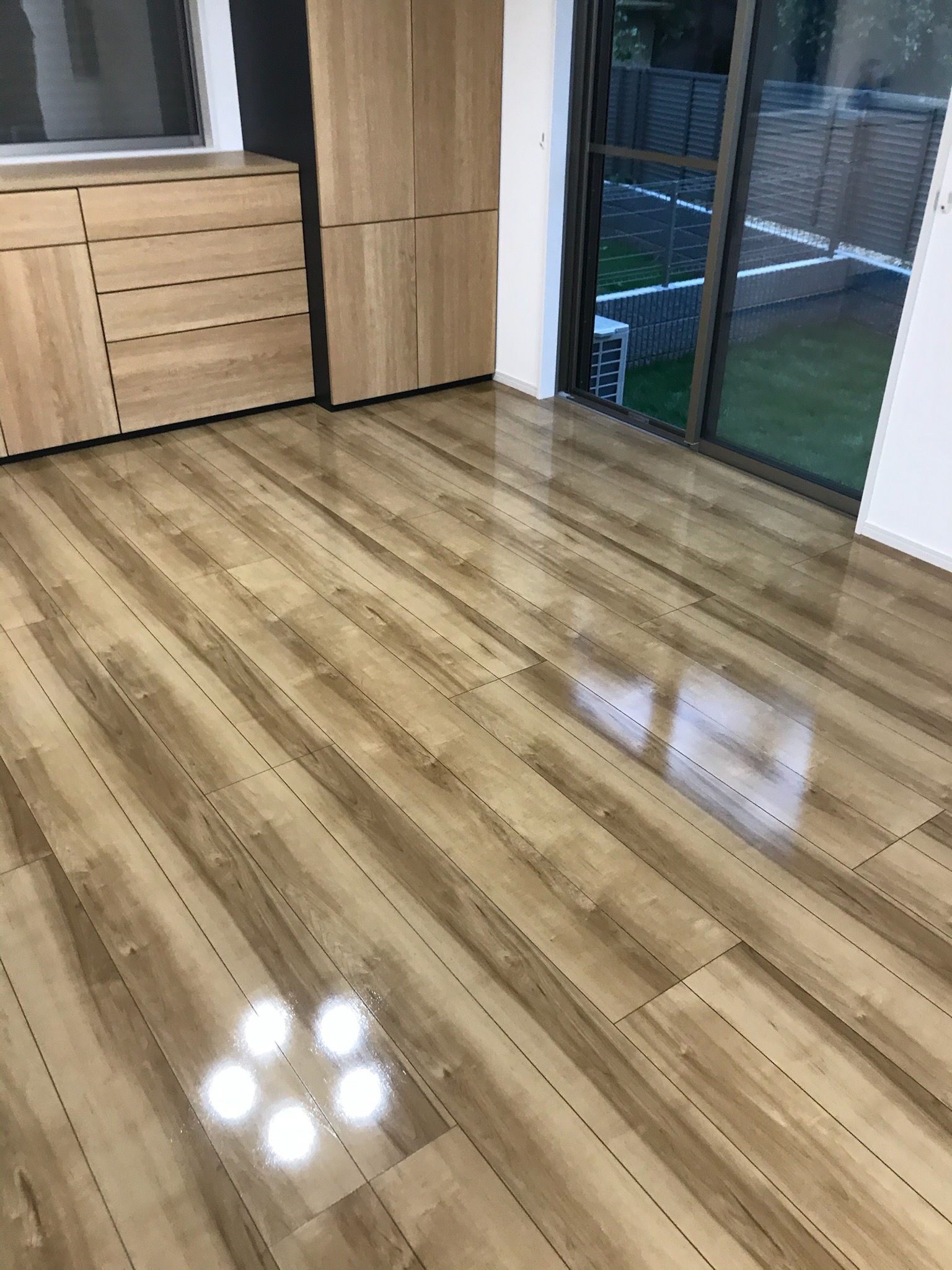 耐久年数は約20年程度と非常に長く、 一度の施工で長期的に床を保護できるため、 住宅だけでなく、商業施設やオフィスなどの人通りが多い場所にも 多く採用されています。光沢が均一でムラになりにくく、 美しい艶を長期間維持できる点も魅力です。